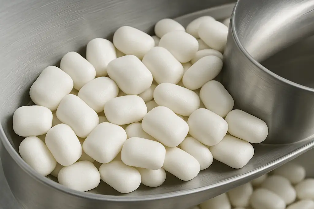 Mit der Integration des kapazitiven Grenzstandmelders RFnivo® – RF 3100 von UWT konnte die Anlage ihre Prozessstabilität erheblich steigern. Die Umrüstung brachte gleich mehrere Vorteile für den Hersteller der Minzbonbons mit sich. Dank der automatischen Kalibrierung stellt sich der 18-Sensor nach einem Spannungsverlust selbstständig wieder ein. Dadurch werden unnötige Stillstände und Produktionsunterbrechungen zuverlässig vermieden. Die integrierte Active-Shield-Technologie sorgt dafür, dass der Sensor unempfindlich gegenüber Anhaftungen an der Sonde bleibt – ein entscheidender Vorteil beim Einsatz in pulverförmigen Medien.
